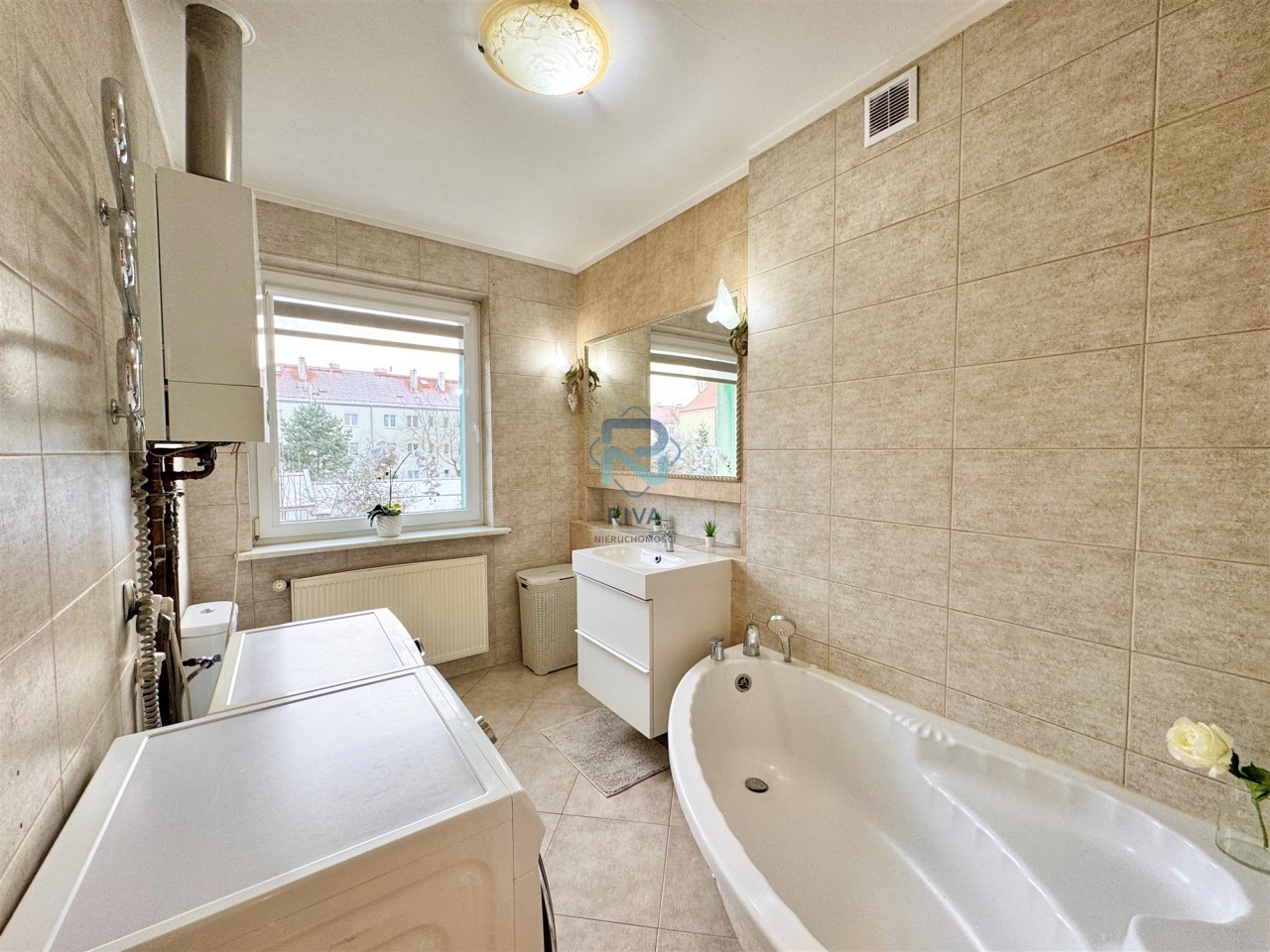 - łazienka z oknem, wanną, umywalką i wc o powierzchni około 6 m2,