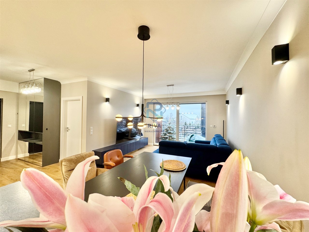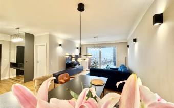 Z salonu prowadzi wyjście na duży, słoneczny taras balkonowy, idealny do relaksu i spędzania czasu na świeżym powietrzu.